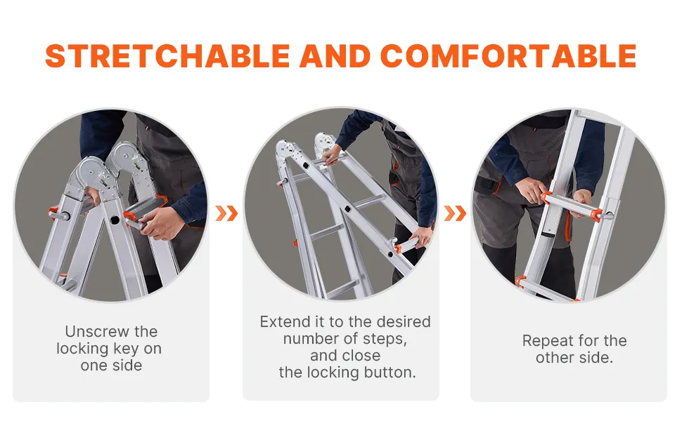 Tę wszechstronną drabinę rozsuwaną w kształcie litery A można rozkładać i składać w wielu konfiguracjach, aby spełnić różne wymagania dotyczące wysokości, dzięki czemu nadaje się do wielu scenariuszy.
