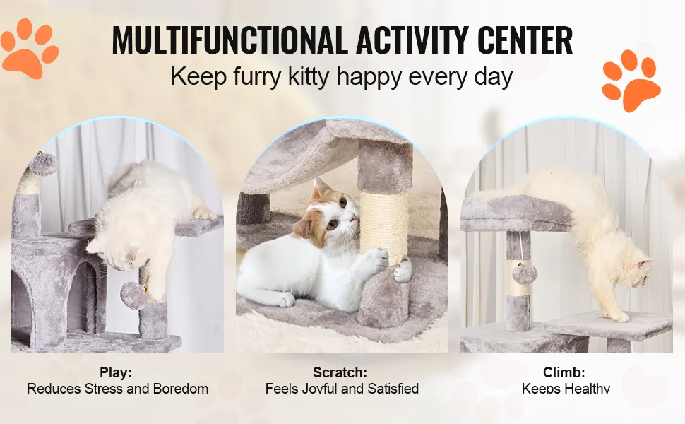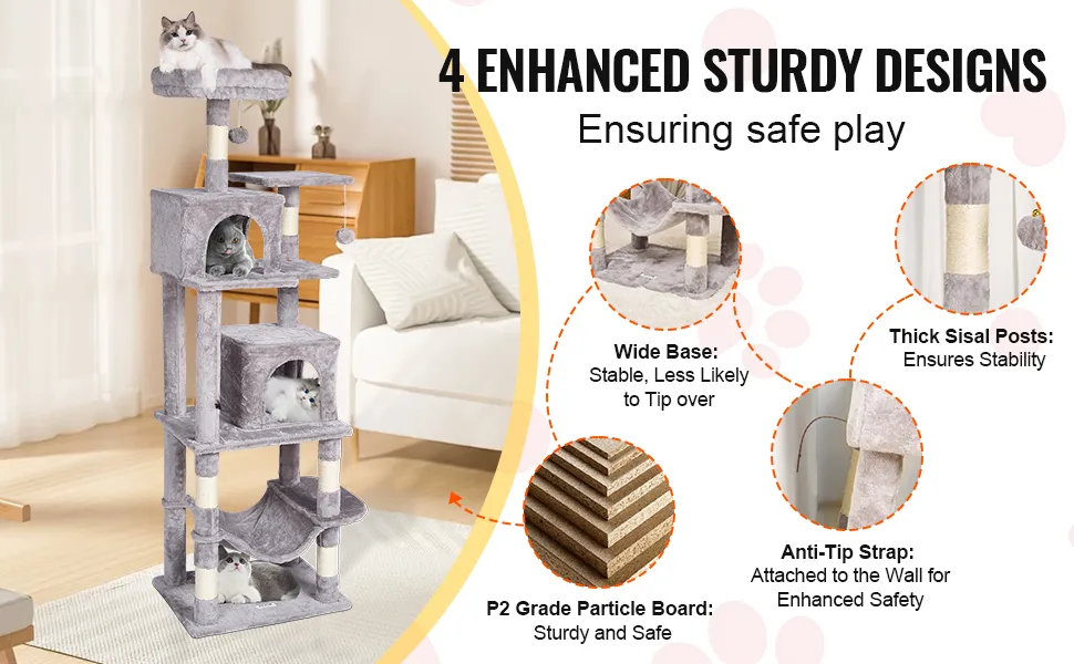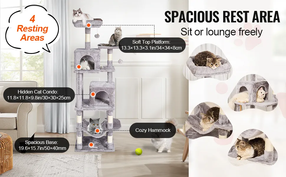Możesz być pewien, że Twoje koty są bezpieczne i wygodne. Ten drapak dla kotów to świetny wybór dla gospodarstw domowych z wieloma kotami, zapewniając wystarczająco dużo miejsca i wsparcia dla wszystkich Twoich kocich przyjaciół. Został zaprojektowany tak, aby pomieścić wiele kotów jednocześnie. Każdy poziom i miejsce odpoczynku może utrzymać znaczną ilość ciężaru.