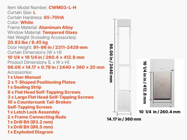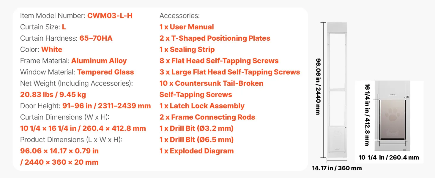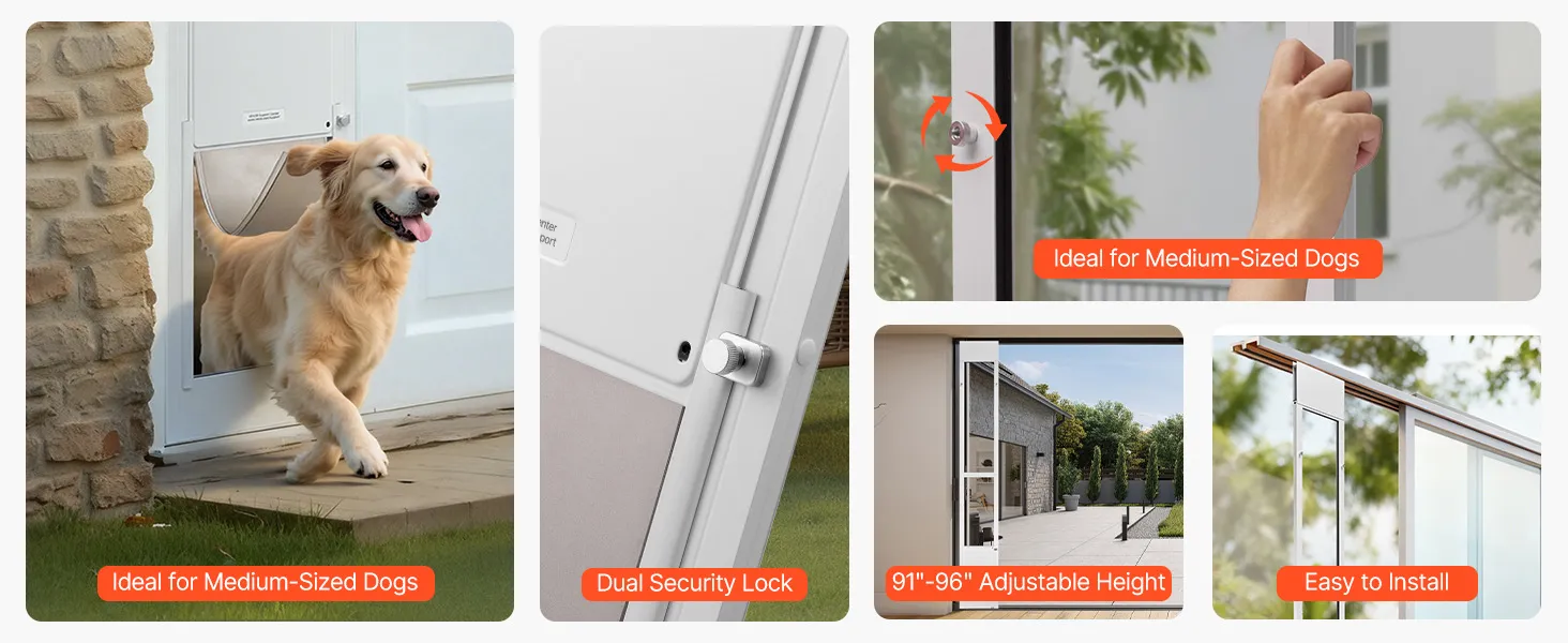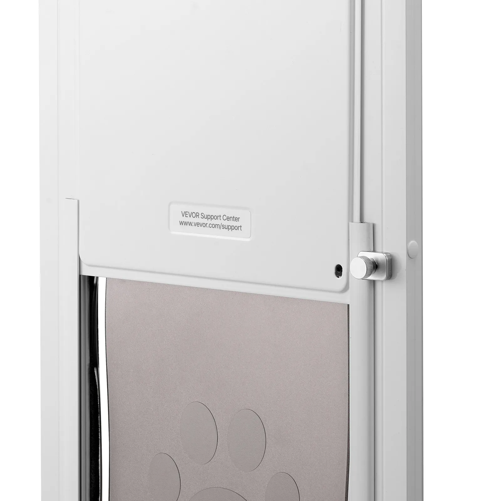 Drzwi dla zwierząt VEVOR Dog Door, do szklanych drzwi przesuwnych, regulowana wysokość 2311–2439 mm, rama ze stopu aluminium z obrotowymi metalowymi zawiasami i zamkiem, wymiary zasłony 260,4 x 412,8 mm, kolor biały