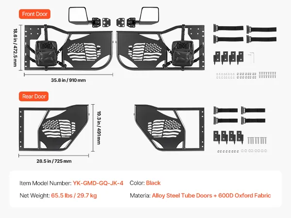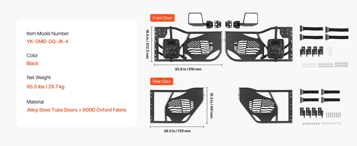 Drzwi rurowe VEVOR 4-drzwiowe, kompatybilne z Jeep Wrangler JK Unlimited (2007-2018), stalowe półdrzwi terenowe (przód i tył) z lusterkami bocznymi z certyfikatem DOT, torbą do przechowywania i gumowymi podkładkami