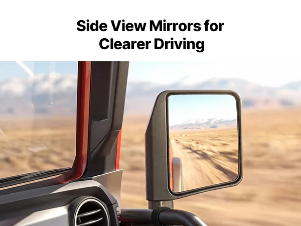 Lusterka boczne z certyfikatem DOT poprawiają widoczność z boku i z tyłu w tych rurowych drzwiach Jeepa, umożliwiając bezpieczniejszą zmianę pasa ruchu. Bezpieczne zapięcia i gumowe zderzaki zwiększają stabilność i redukują hałas na nierównych drogach.