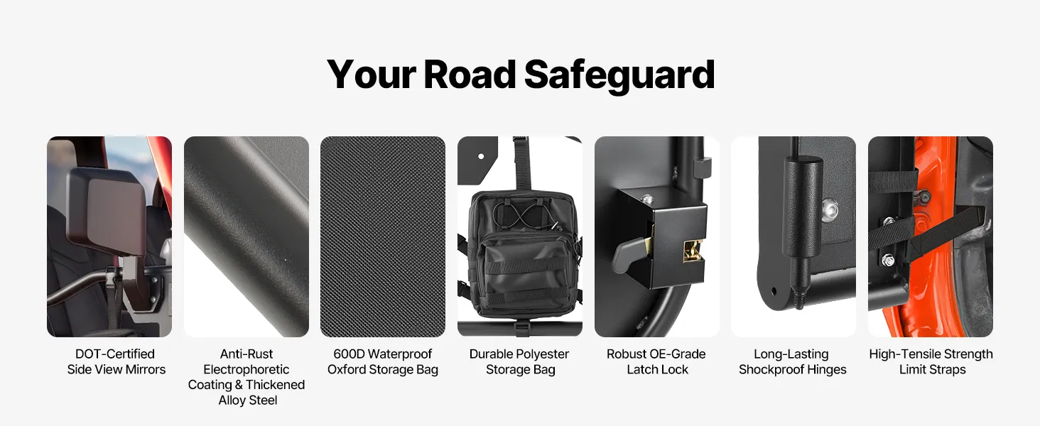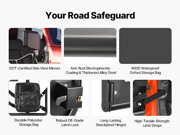 Drzwi z ramą rurową, wyposażone w zgodne z normami DOT lusterka zamienne, wzmocnione rury stalowe, torbę do przechowywania, zamki w drzwiach, amortyzujące zawiasy i pasy blokujące, zapewniają niezawodną ochronę i gwarantują stabilne prowadzenie podczas jazdy zarówno w terenie, jak i na autostradzie.