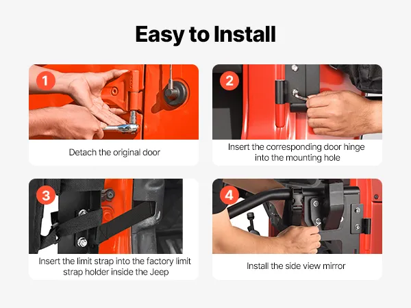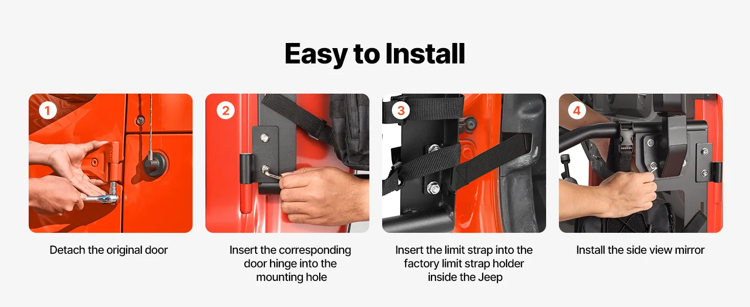 Drzwi rurowe są zaprojektowane z myślą o łatwym montażu i nie wymagają specjalistycznych narzędzi ani wiedzy. Wystarczy zdemontować oryginalne drzwi, zamontować zawiasy i pasy mocujące, dokręcić śruby i zamontować lusterka. Idealne dla początkujących i miłośników jazdy terenowej.