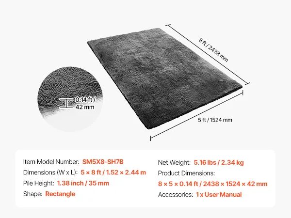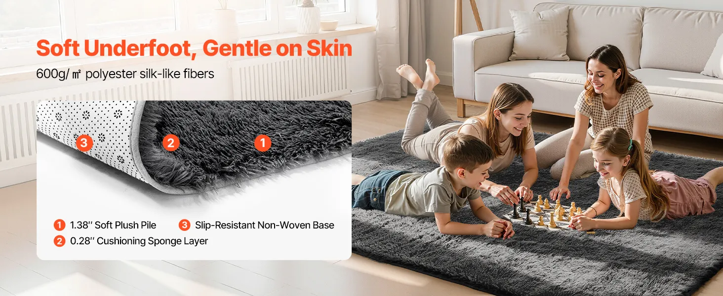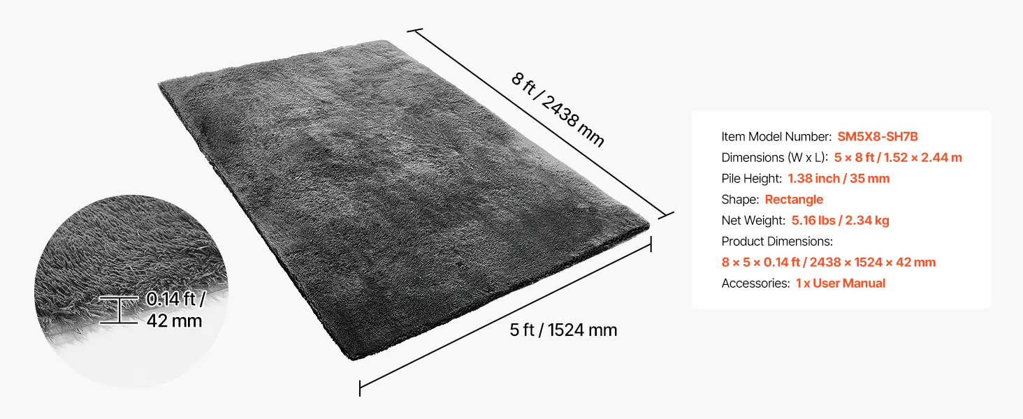 Dywan VEVOR z długim włosiem 2438 x 1524 mm, pluszowy dywan z trójwarstwowego materiału, wysokość włosia 35 mm, dywan do salonu, sypialni, ogrodu zimowego, niepylący i miękki, antypoślizgowy, szary