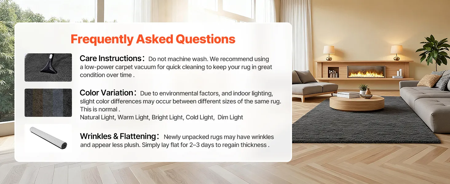 Utrzymaj dywan w świeżości, odkurzając go odkurzaczem o niskiej mocy, ponieważ nie nadaje się on do prania. Mogą wystąpić niewielkie różnice w kolorze ze względu na oświetlenie i rozdzielczość urządzenia. Po otrzymaniu rozłóż dywan i pozostaw go w pozycji leżącej na płasko na 2-3 dni, aby odzyskał miękkość i objętość.