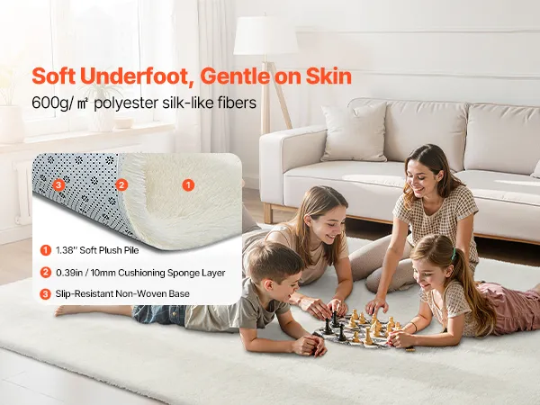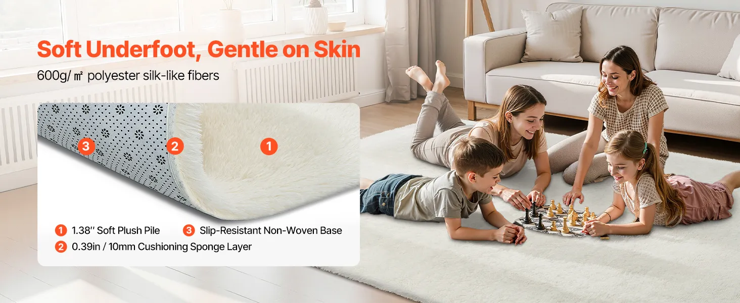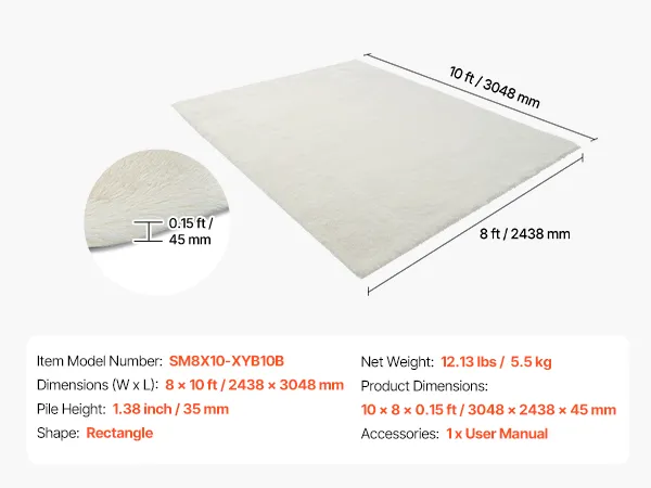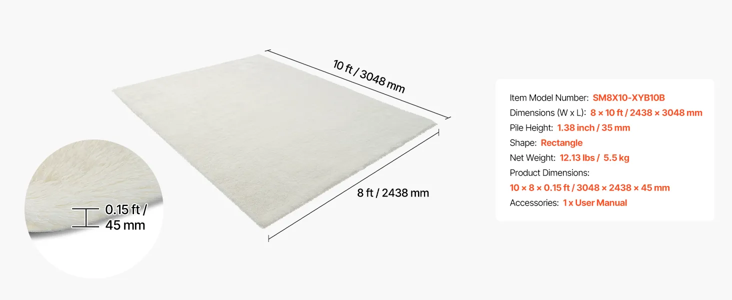 Dywan VEVOR z długim włosiem 3048 x 2438 mm, puszysty dywan do salonu z trójwarstwowym materiałem, wysokość włosia 35 mm, do salonu, sypialni, pokoju wypoczynkowego, niepylący i miękki, biały
