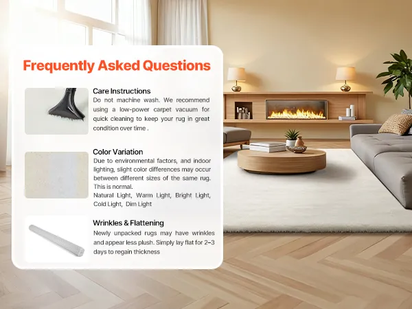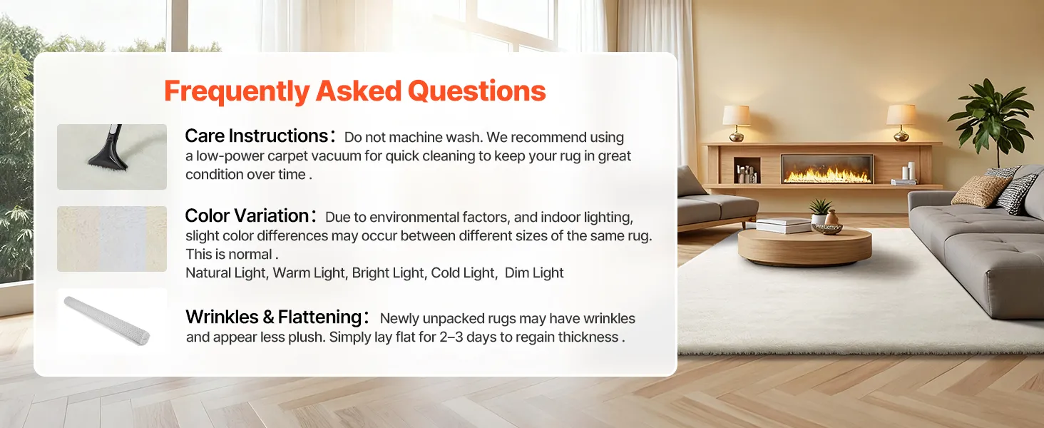 Utrzymaj dywan w świeżości, odkurzając go odkurzaczem o niskiej mocy, ponieważ nie nadaje się on do prania. Mogą wystąpić niewielkie różnice w kolorze ze względu na oświetlenie i rozdzielczość urządzenia. Po otrzymaniu rozłóż dywan i pozostaw go w pozycji leżącej na płasko na 2-3 dni, aby odzyskał miękkość i objętość.
