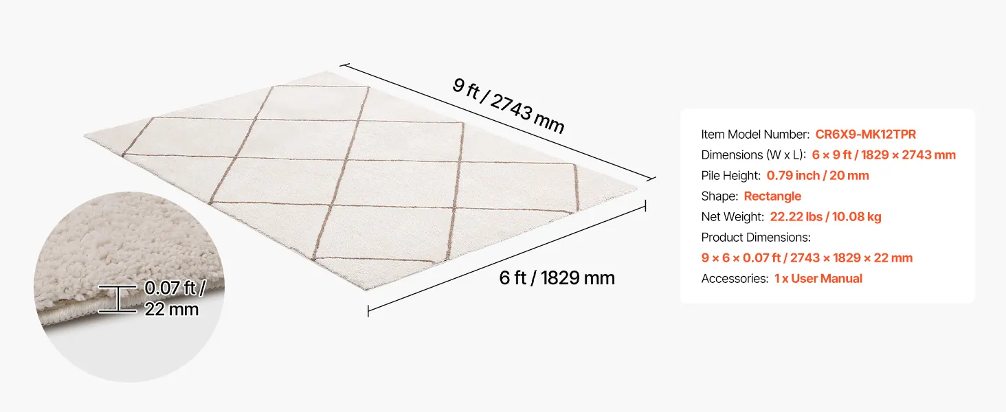 Dywan VEVOR z krótkim włosiem 2743 x 1829 mm, przytulny dywan do salonu, wysokość włosia 20 mm, dywan do salonu, sypialni, ogrodu zimowego, niepylący, z antypoślizgowym spodem z tworzywa TPR, biały