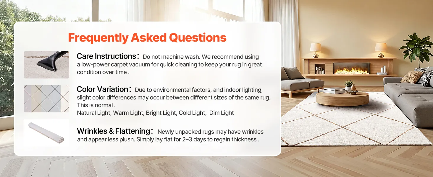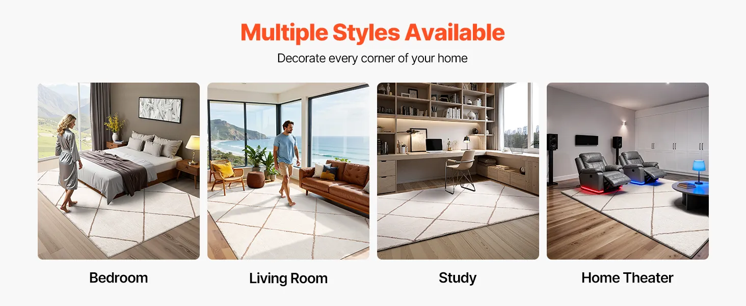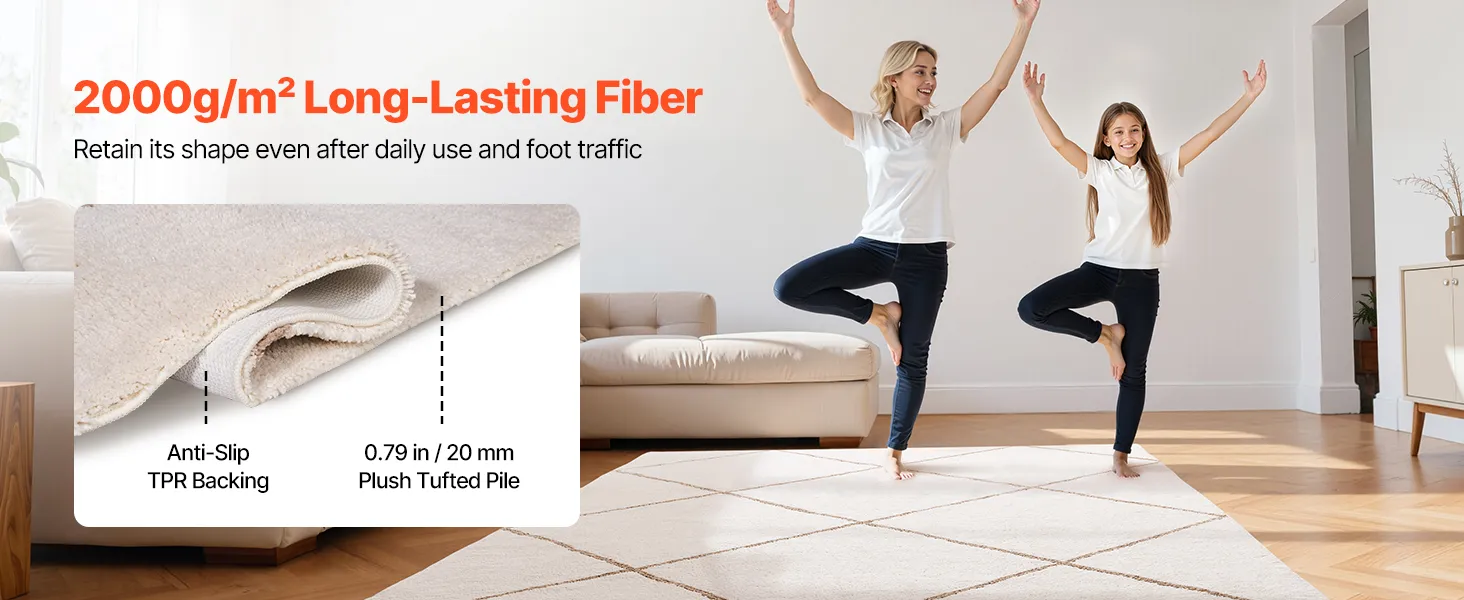 Stabilny, antypoślizgowy spód: Ten miękki, pluszowy dywan z podkładem TPR mocno przylega do podłogi, minimalizując przesuwanie się i unoszące się krawędzie. Chodzenie boso jest komfortowe i bezpieczne, zmniejsza ryzyko potknięcia i stanowi niezawodny wybór do sypialni lub salonu.