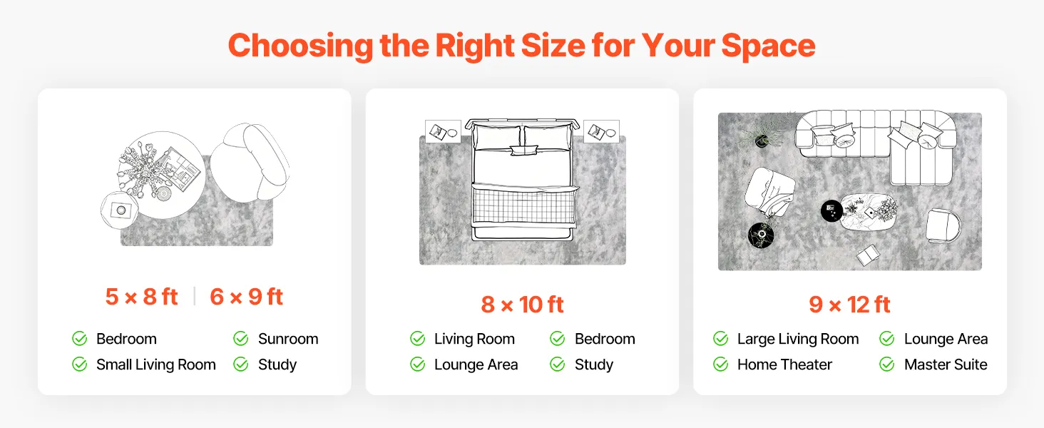 Różne rozmiary: Znajdź idealny rozmiar dzięki naszemu pluszowemu dywanowi do salonu. Dostępny w rozmiarach M, L i XL. Nadaje się do sypialni, gabinetów lub przestronnych salonów. Te rozmiary pozwalają na dopasowanie go do wymiarów Twojego domu.