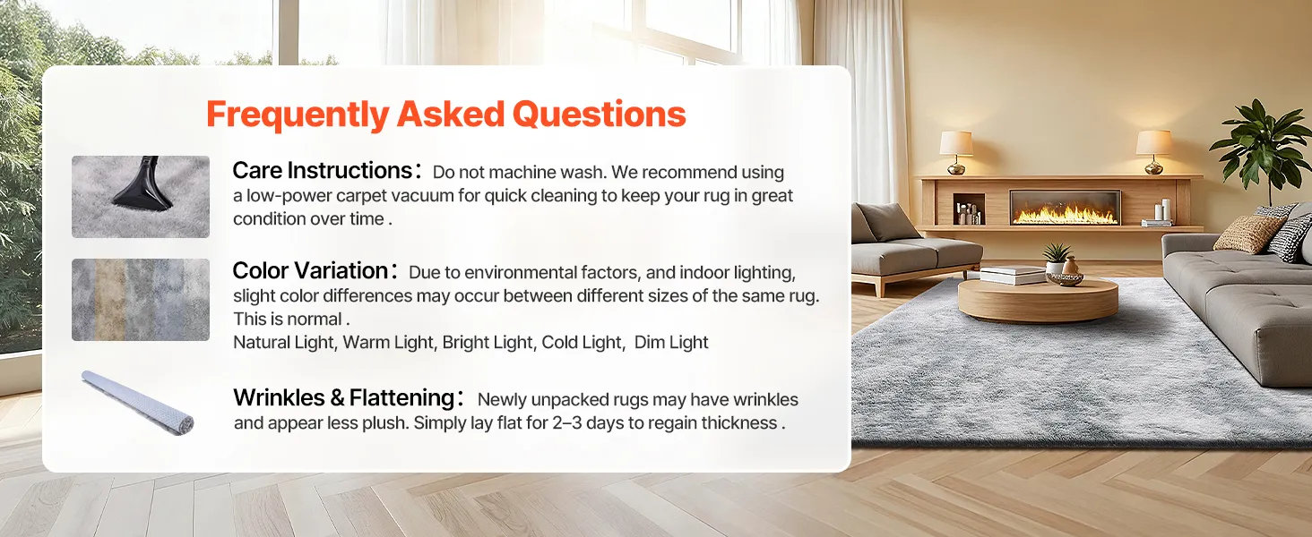 Instrukcje dotyczące pielęgnacji: Tego włochatego dywanu nie należy prać. Zamiast tego należy użyć odkurzacza o małej mocy. Uwaga: kolory mogą się nieznacznie różnić w zależności od oświetlenia i ustawień ekranu. Po otrzymaniu wystarczy rozłożyć dywan na płasko na 2-3 dni, aby przywrócić mu puszystość.
