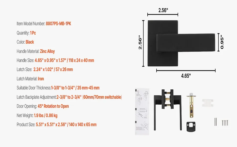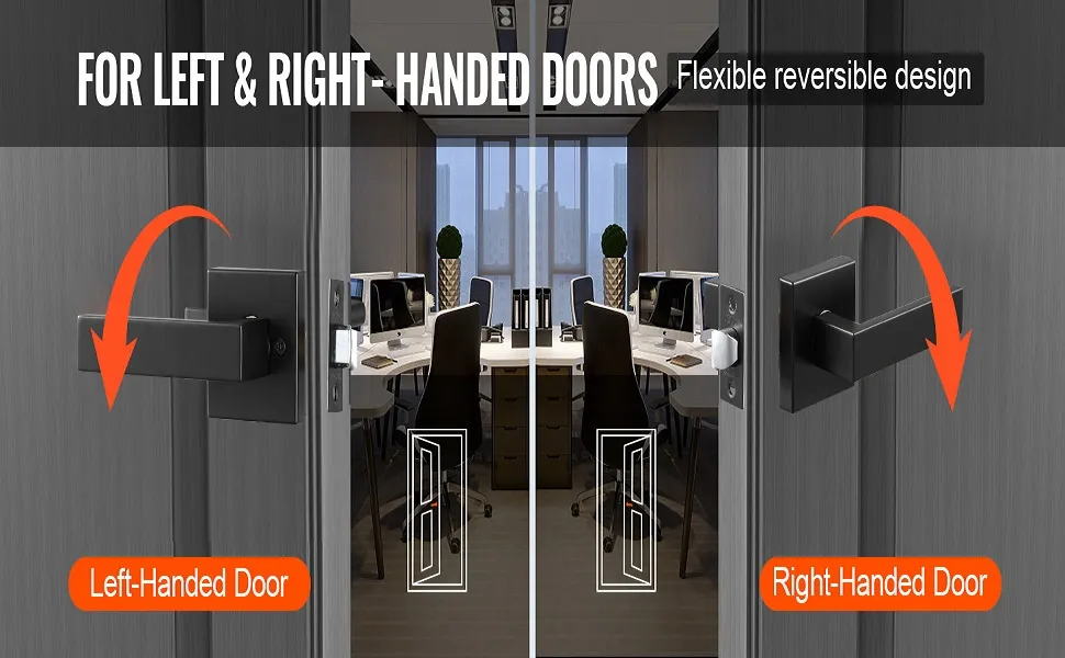 Uniwersalna i odwracalna konstrukcja: Nasza czarna klamka do drzwi ma regulowany zatrzask 2-3/8 cala (60 mm) lub 2-3/4 cala (70 mm), odpowiedni do drzwi o grubości od 1-3/8 cala (35 mm) do 1-3/4 cala (45 mm). Odwracalna konstrukcja umożliwia montaż zarówno na drzwiach lewych, jak i prawych, dzięki czemu nadaje się do ponad 95% drzwi wewnętrznych.