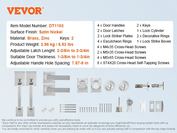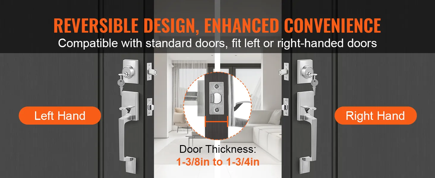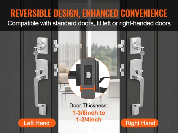 Nasz zestaw podwójnych klamek do drzwi przednich zawiera dwie wysokiej jakości kwadratowe klamki do drzwi, które pasują zarówno do drzwi lewych, jak i prawych. Są kompatybilne ze standardowymi drzwiami o grubości od 1-3/8 do 1-3/4 cala. Możesz czuć się bezpiecznie, wiedząc, że Twoje drzwi są chronione zewnętrznym zamkiem na klucz i wewnętrznym zamkiem bezpieczeństwa.