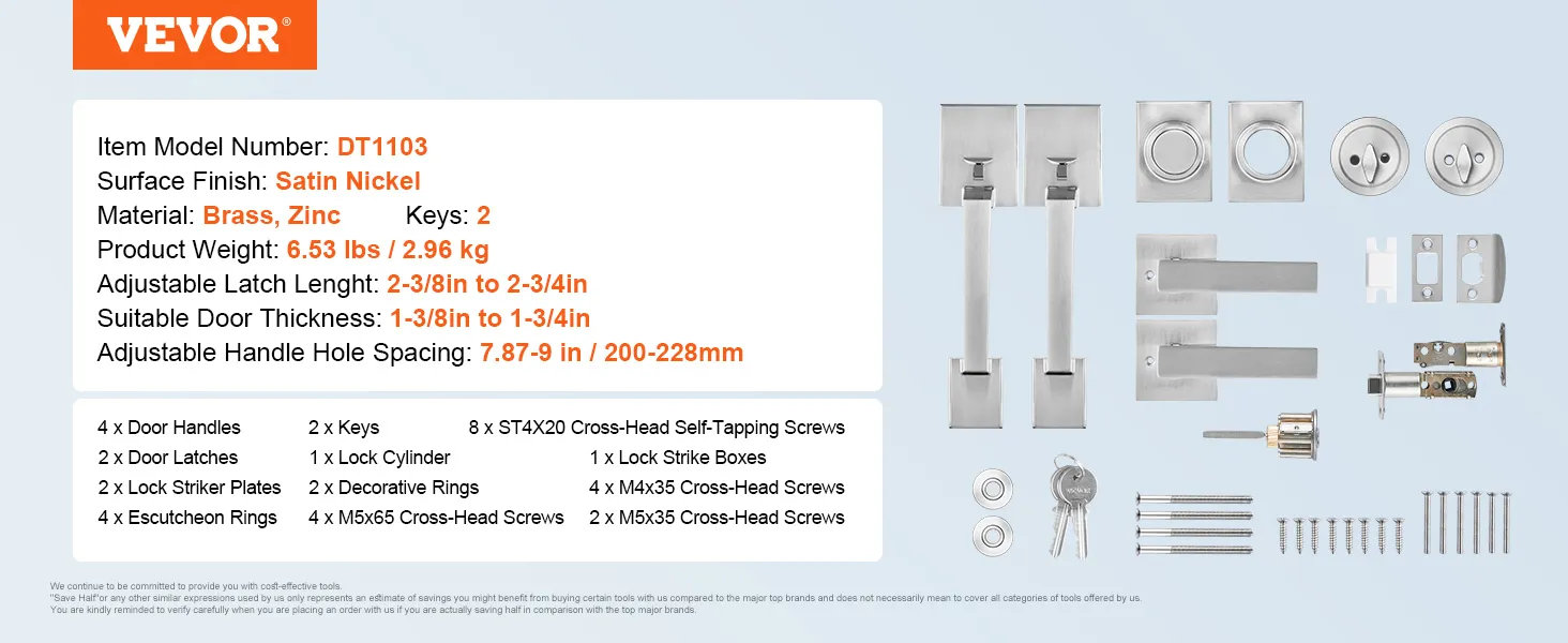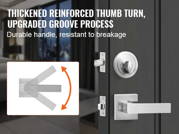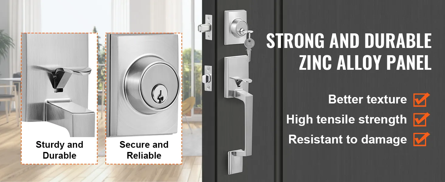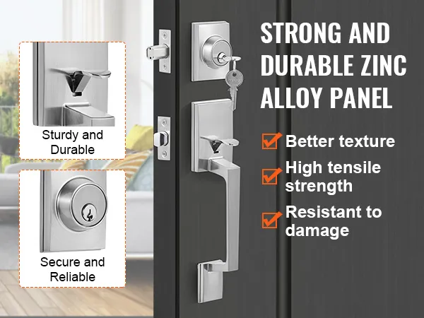 Zbudowaliśmy ten zestaw tak, aby służył przez lata. Posiada odlewaną ciśnieniowo konstrukcję ze stopu cynku, zapewniającą wysoką wytrzymałość na rozciąganie i odporność na rdzę i korozję. Czuj się bezpiecznie dzięki zewnętrznemu zamkowi na klucz i wewnętrznemu zamkowi bezpieczeństwa naszego zestawu podwójnych klamek do drzwi. Do tych narzędzi odpowiednie jest tylko użycie zamka do drzwi o dużej wytrzymałości.