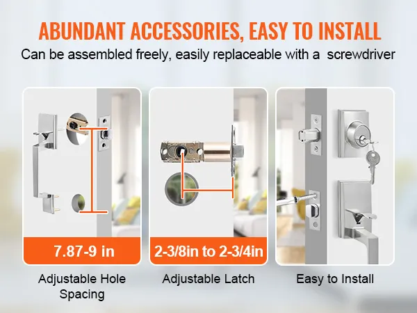 Mamy regulowaną konstrukcję odstępu otworów. Zakres wynosi od 7,87 cala do 8,98 cala. Ta funkcja pozwala na wykorzystanie istniejących otworów bez konieczności ponownego wiercenia. Elastyczność regulowanej konstrukcji zapewnia wygodny proces instalacji. Jest więc idealna do wymiany. Niezależnie od tego, czy aktualizujesz drzwi przednie, tylne czy biurowe, nasz zestaw klamek zapewnia funkcjonalność i styl, aby ulepszyć Twoją przestrzeń.