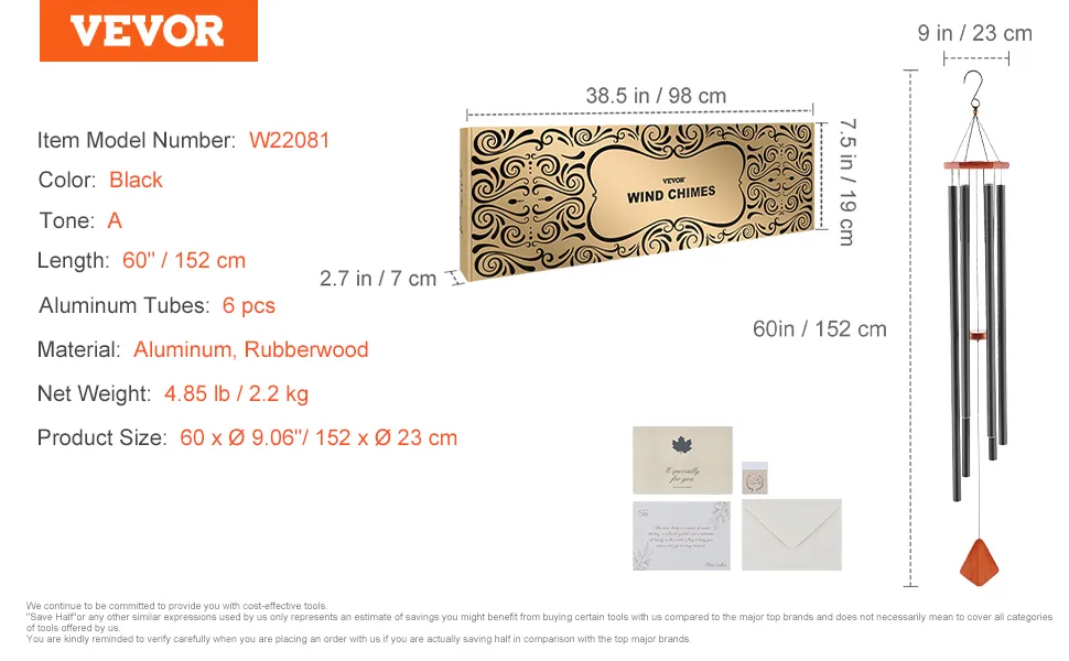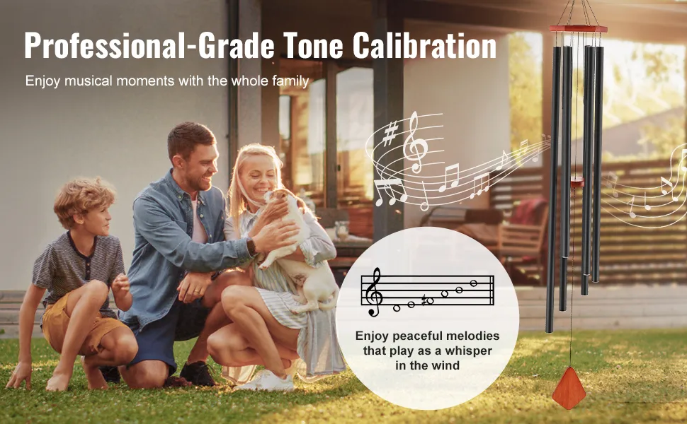 Dzwonek wietrzny VEVOR Outdoor, 60-calowy dzwonek wietrzny o głębokim tonie, 6-rurowy, wyjątkowy, duży dzwonek wietrzny z okazji rocznicy, wspaniała dekoracja na patio, werandę, do ogrodu i na podwórko, czarny