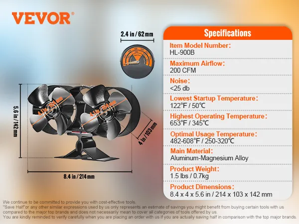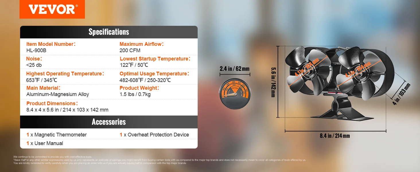 Montaż nie jest wymagany: ten wentylator kominkowy ma wymiary całkowite (dł. x szer. x wys.) 204 x 92 x 138 mm i nie wymaga montażu. Nie potrzebuje też prądu. Maksymalna temperatura pracy: 345℃, optymalna temperatura pracy. Zakres: 250-320 ℃ Uwaga: Trzymaj agregat prądotwórczy z dala od źródła ciepła, aby chronić żywotność agregatu prądotwórczego i silnika.