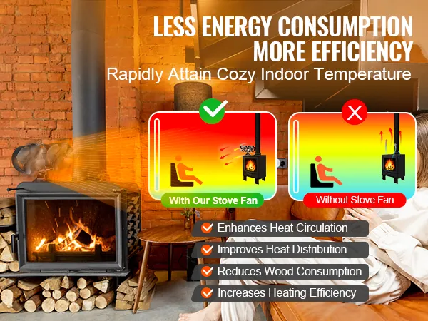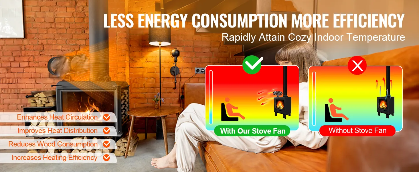 Większa wydajność: ten wentylator kominkowy równomiernie rozprowadza ciepło do wszystkich zakątków pomieszczenia, szybko zwiększając ogólny komfort. Jednocześnie start w niskiej temperaturze skutecznie zmniejsza zużycie drewna, minimalizuje straty energii i zmniejsza koszty energii w gospodarstwie domowym.