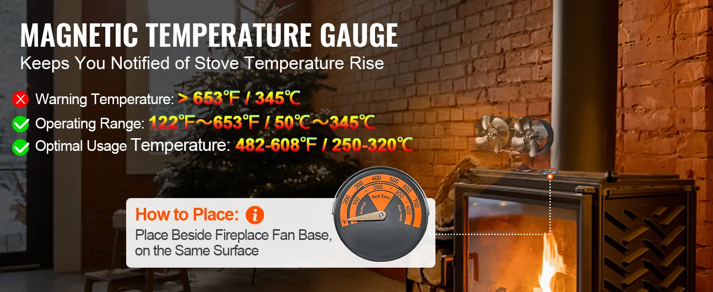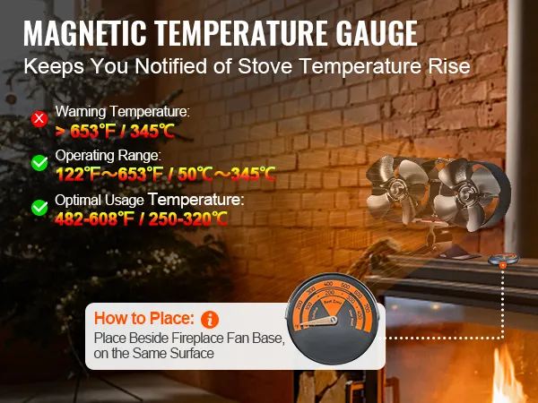 Nasz wentylator kominkowy jest wyposażony w termometr magnetyczny. Aby użyć termometru, umieść go na tej samej powierzchni obok podstawy wentylatora, aby monitorować temperaturę roboczą wentylatora.