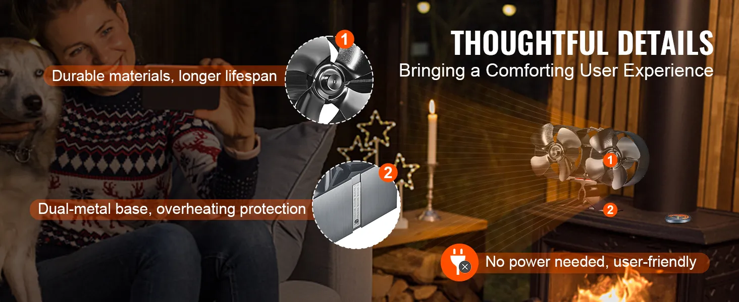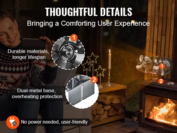 Przemyślane szczegóły: ten wentylator kominkowy jest łatwy w obsłudze. Zaczyna działać, gdy temperatura osiągnie 80 ℃. Podstawa jest wyposażona w podwójne metalowe urządzenie zabezpieczające, które delikatnie podnosi przód wentylatora, aby chronić TEG i silnik, gdy temperatura powierzchni przekracza 345 ℃.
