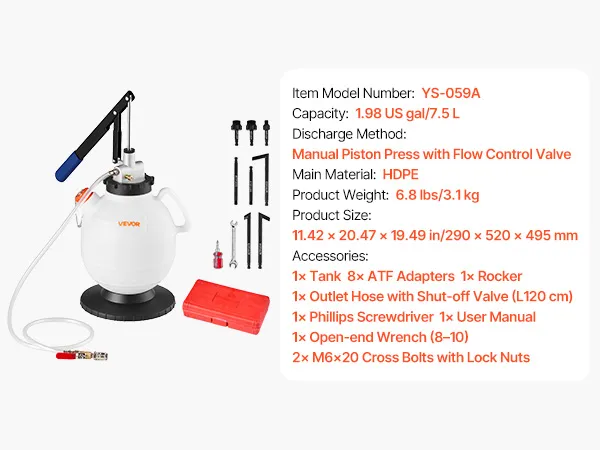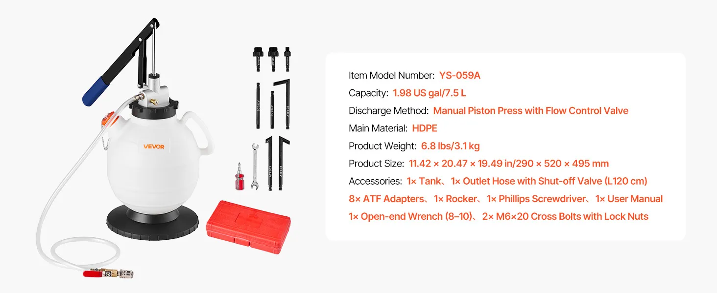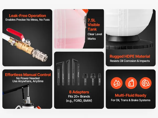 Pompa oleju przekładniowego VEVOR, pojemność 7,5 l, ręczny wlew oleju ATF z 8 adapterami ATF i wylotem 120 cm, pompa do ekstrakcji oleju ze zbiornikiem HDPE do samochodów i kosiarek do trawy