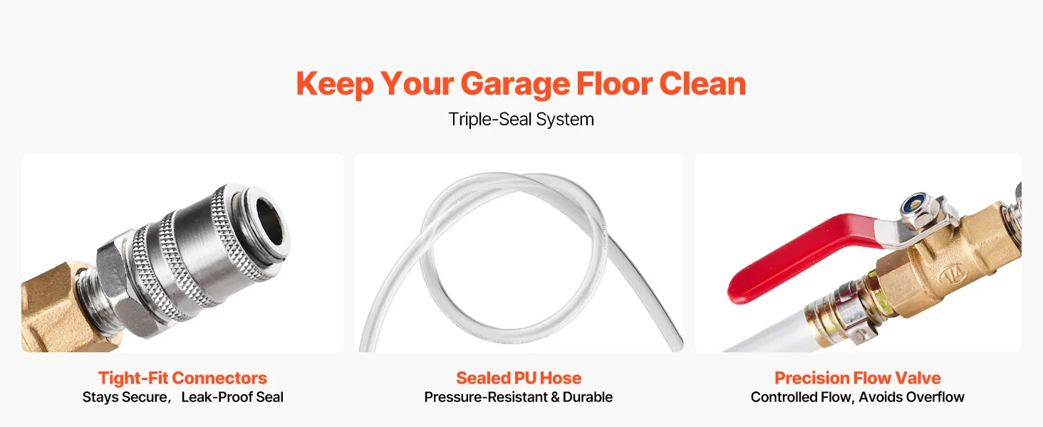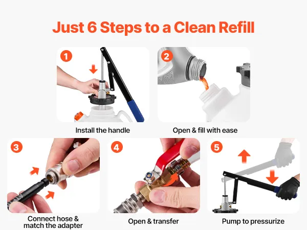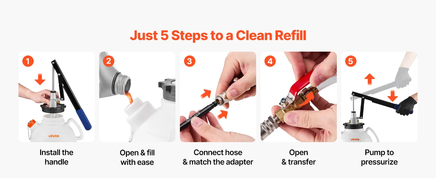 • Przezroczysty zbiornik o pojemności 7,5 litra: Ten duży, przezroczysty zbiornik naszego urządzenia do napełniania wystarcza na jedno tankowanie do kilku samochodów lub dużego pojazdu. Zawsze masz dobrą widoczność przepływu oleju, co zapobiega przepełnieniu i zanieczyszczeniom.