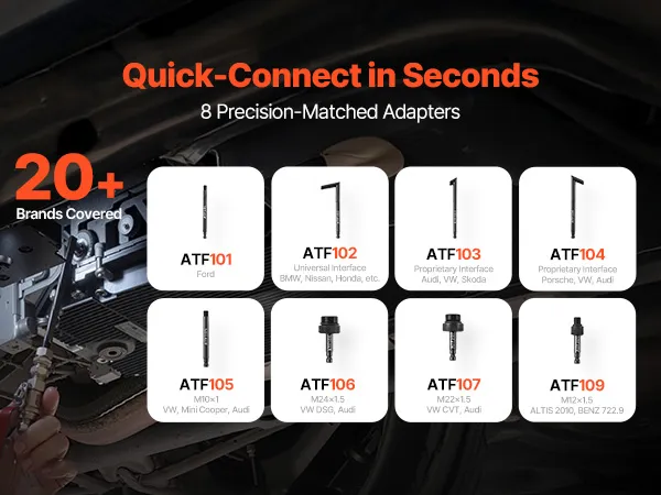 • Idealnie dopasowane adaptery: Ten zestaw pompy oleju przekładniowego zawiera 8 metalowych adapterów do napełniania ATF (1/8 cala-27, M10x1,0, M24x1,5 i inne), które są kompatybilne z pojazdami marki Ford, BMW, VW/Audi, Honda, Nissan i innymi – wystarczy podłączyć i jeździć.