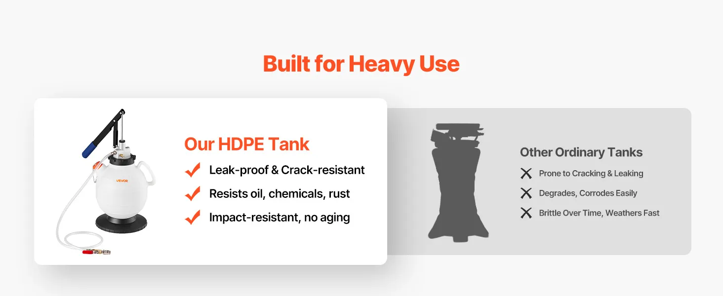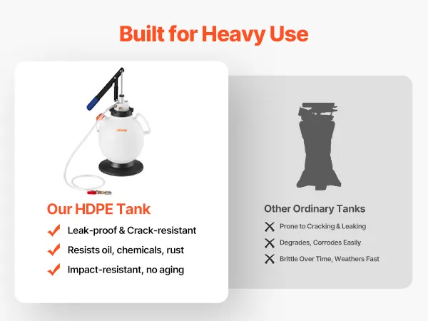 • Trwałość i niezawodność: Pojemnik z HDPE pompy do ekstrakcji oleju samochodowego jest odporny na olej i chemikalia. Wzmocnione metalowe adaptery wytrzymują częste użytkowanie, a elastyczny wąż poliuretanowy można zginać bez załamywania, aby zminimalizować ryzyko wycieków.