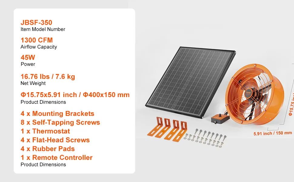 Wentylator solarny VEVOR, 400 x 150 mm, zasilany energią słoneczną, wentylator wyciągowy na strych z regulowanym termostatem, kratka zewnętrzna, wydajność przepływu powietrza 1300 CFM, do szczytów, dachów, garaży, warsztatów