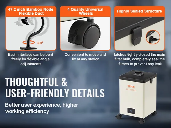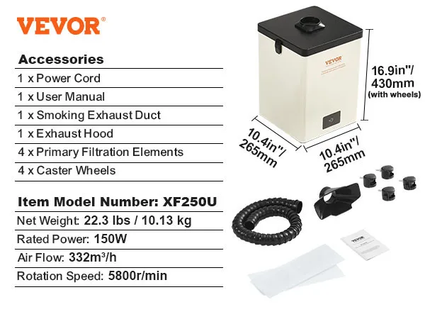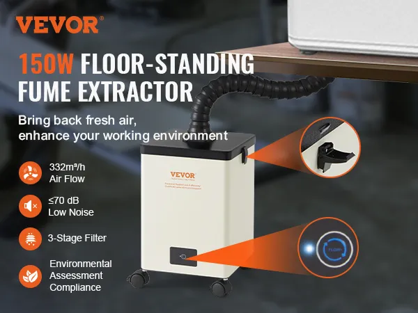 Mocny wyciąg 150 W: Oddychaj swobodnie podczas lutowania z wyciągiem oparów lutowniczych VEVOR! Mocny silnik o mocy 150 W generuje silny przepływ powietrza 332 m³/h, aby szybko usunąć dym i szkodliwe opary. Koniec z wdychaniem szkodliwych oparów – Twoje dobre samopoczucie jest naszym priorytetem!
