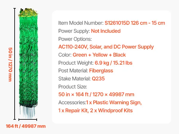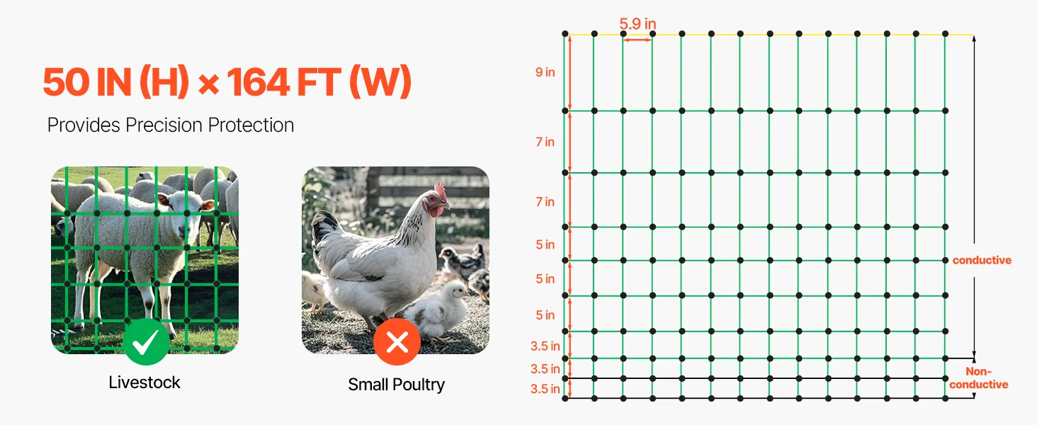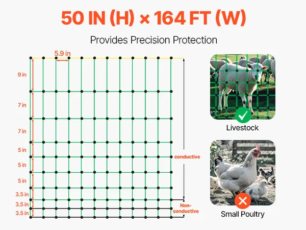 Kompleksowy projekt rozmiarów: Siatka ogrodzenia elektrycznego ma wymiary 50 cali x 164 stopy (1270 x 49987 mm), z naukowo ułożonymi kratami i podwójnie przybitymi słupkami, co gwarantuje bezpieczne i stabilne ogrodzenie dla zwierząt każdej wielkości.