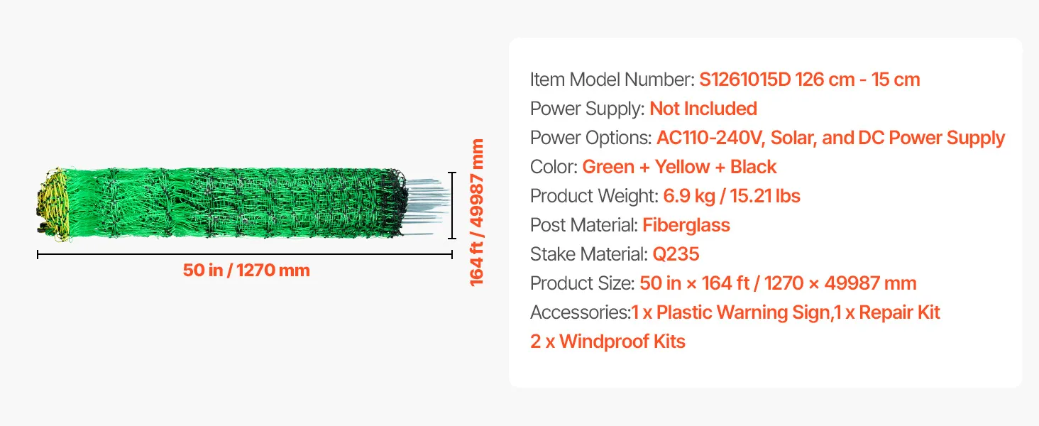 Siatka elektryczna VEVOR, wys. 127 cm x dł. 49 m, siatka ogrodzeniowa dla zwierząt gospodarskich ze słupkami i palikami, siatka oczkowa dla kóz, owiec, jeleni, świń, psów, ogrodzenie elektryczne do podwórek, ogrodów, gospodarstw rolnych i rancz