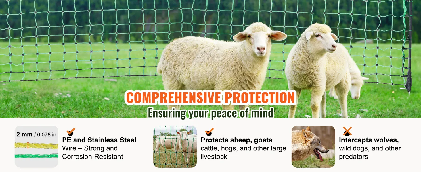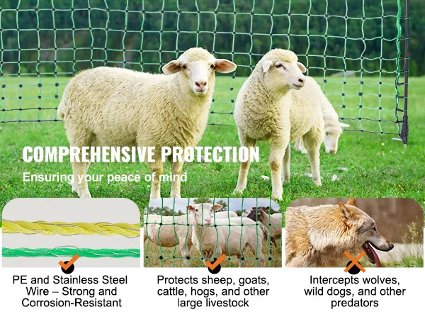 Szerokie zastosowanie: Ta elektryczna siatka ogrodzeniowa jest idealna dla owiec, jeleni, świń, psów i innych dużych zwierząt gospodarskich, zapewniając niezawodną ochronę Twojego gospodarstwa lub pastwiska.