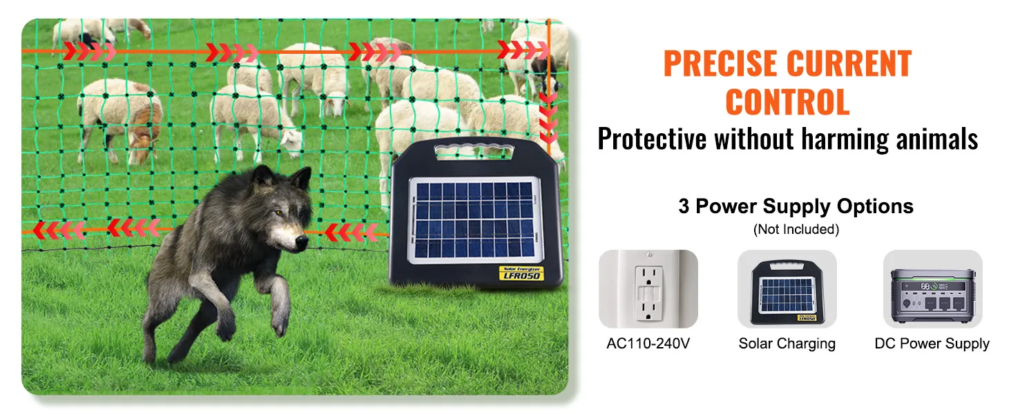 Wiele opcji zasilania: To ogrodzenie elektryczne jest kompatybilne z prądem zmiennym 110–240 V i panelami słonecznymi (brak w zestawie) i oferuje wydajne rozwiązania energetyczne dla Twojego gospodarstwa.