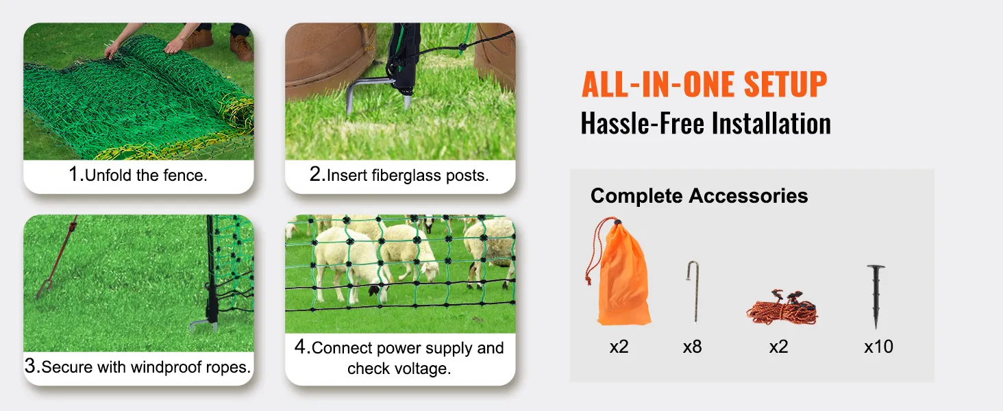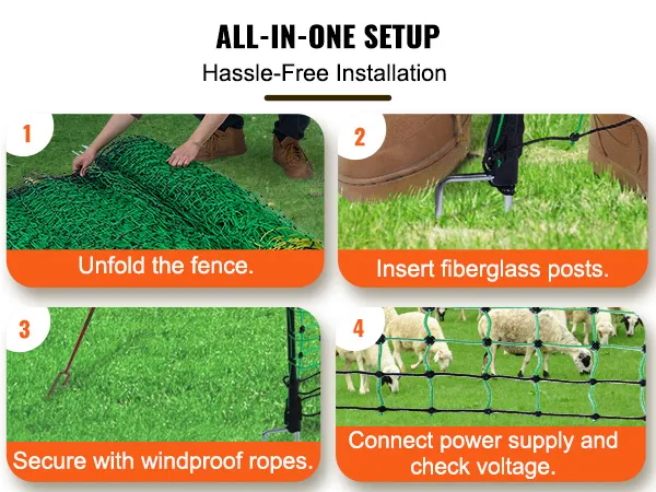 Wytrzymała i trwała: Ta siatka ogrodzenia elektrycznego jest odporna na warunki atmosferyczne i wyposażona w osłony przeciwwiatrowe oraz słupki z włókna szklanego, co zapewnia długotrwałe użytkowanie. Znak ostrzegawczy i zestaw naprawczy ułatwiają konserwację i utrzymują ogrodzenie w doskonałym stanie.