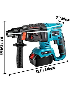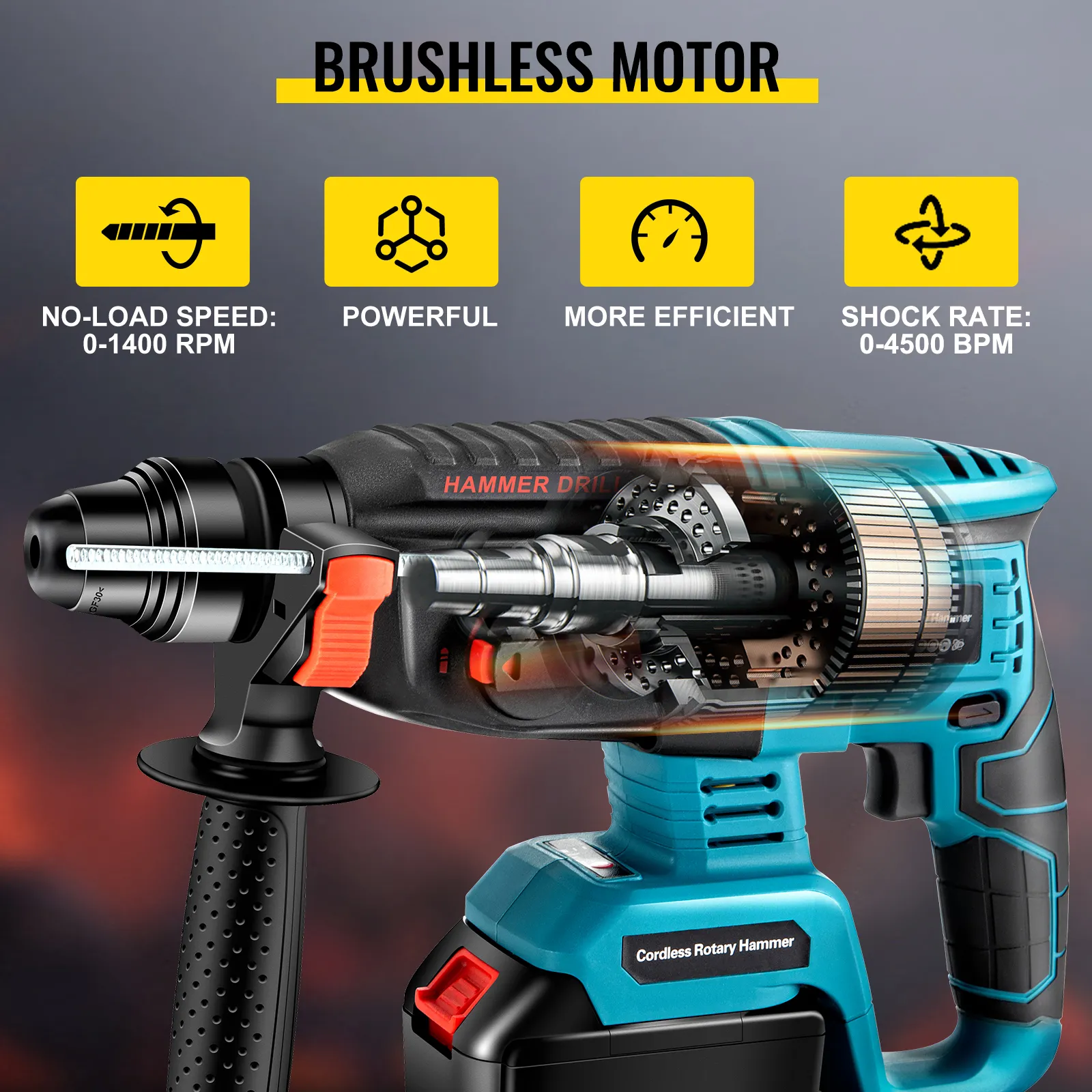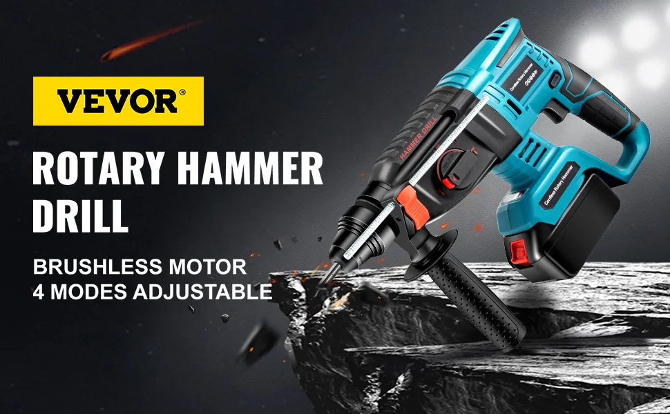 Młotowiertarka VEVOR jest wyposażona w bezszczotkowy, miedziany silnik, który zapewnia dużą moc do wiercenia. Prędkość obrotowa może wynosić do 1400 obr./min. Cztery funkcje pozwalają wykonywać różne zadania. Wymiana wierteł jest łatwa dzięki metalowemu uchwytowi wiertarskiemu. Kompaktowy korpus waży tylko 6,6 funta (ok. 3 kg), dzięki czemu jest idealną wiertarką do różnych scenariuszy pracy.