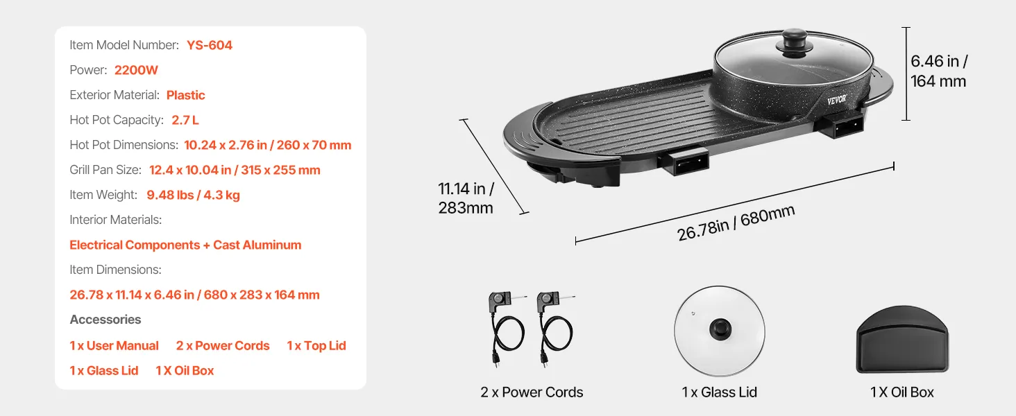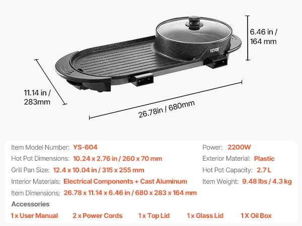 Nasz zestaw do grillowania i gotowania na gorącym garnku o pojemności 2,7 l składa się z garnka o wymiarach 260 x 70 mm i patelni grillowej o wymiarach 315 x 255 mm, dzięki czemu jest wystarczająco duży, aby przygotować pełny posiłek w gronie rodziny i przyjaciół.