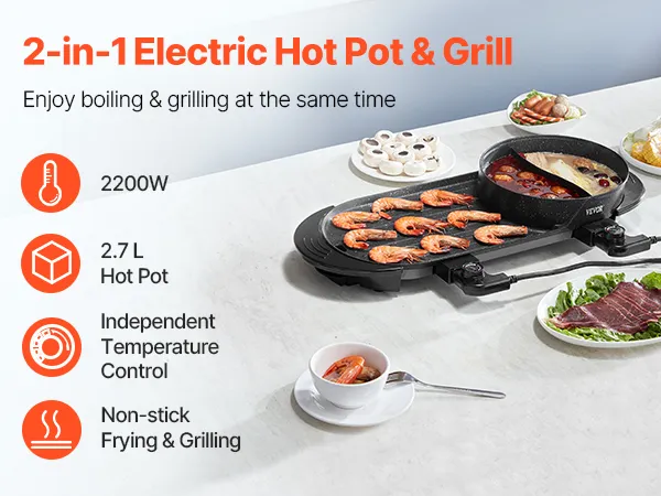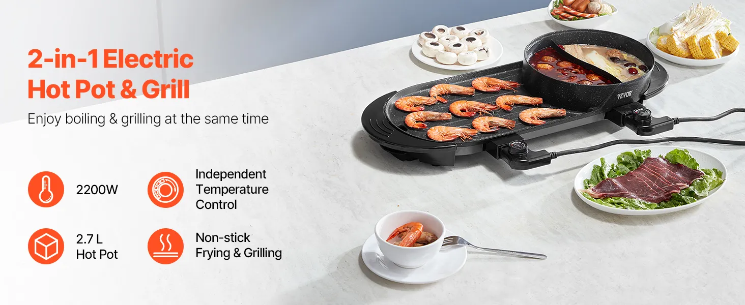 VEVOR Hot Pot z grillem, 2200 W, 2 w 1, elektryczny grill bezdymny i garnek, koreański BBQ Shabu Hot Pot z oddzielną podwójną kontrolą temperatury i patelniami nieprzywierającymi