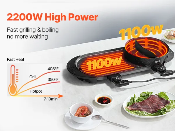 Zbierz znajomych bez konieczności czekania. Dzięki dużej mocy wynoszącej 2200 W nasz garnek i grill nagrzewają się szybko, dzięki czemu możesz w mgnieniu oka rozpocząć przygotowywanie posiłku, niezależnie od tego, czy grillujesz, czy gotujesz.