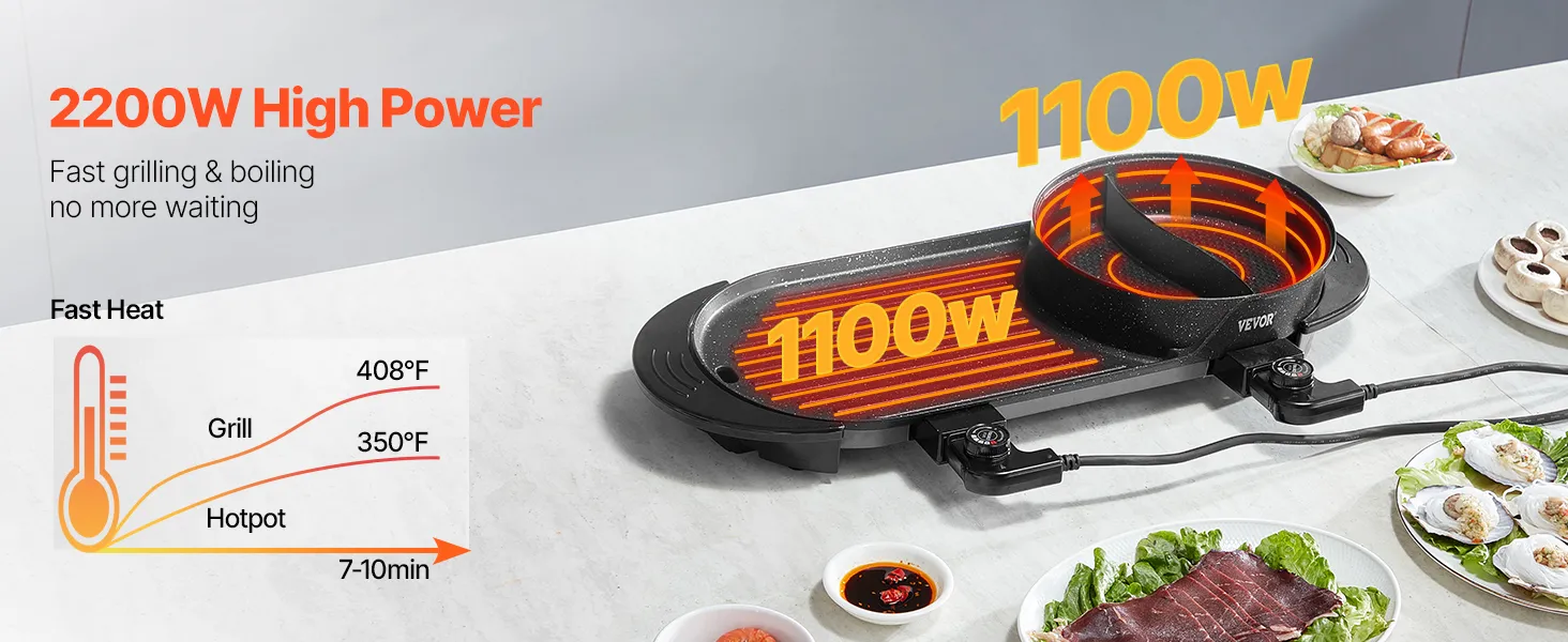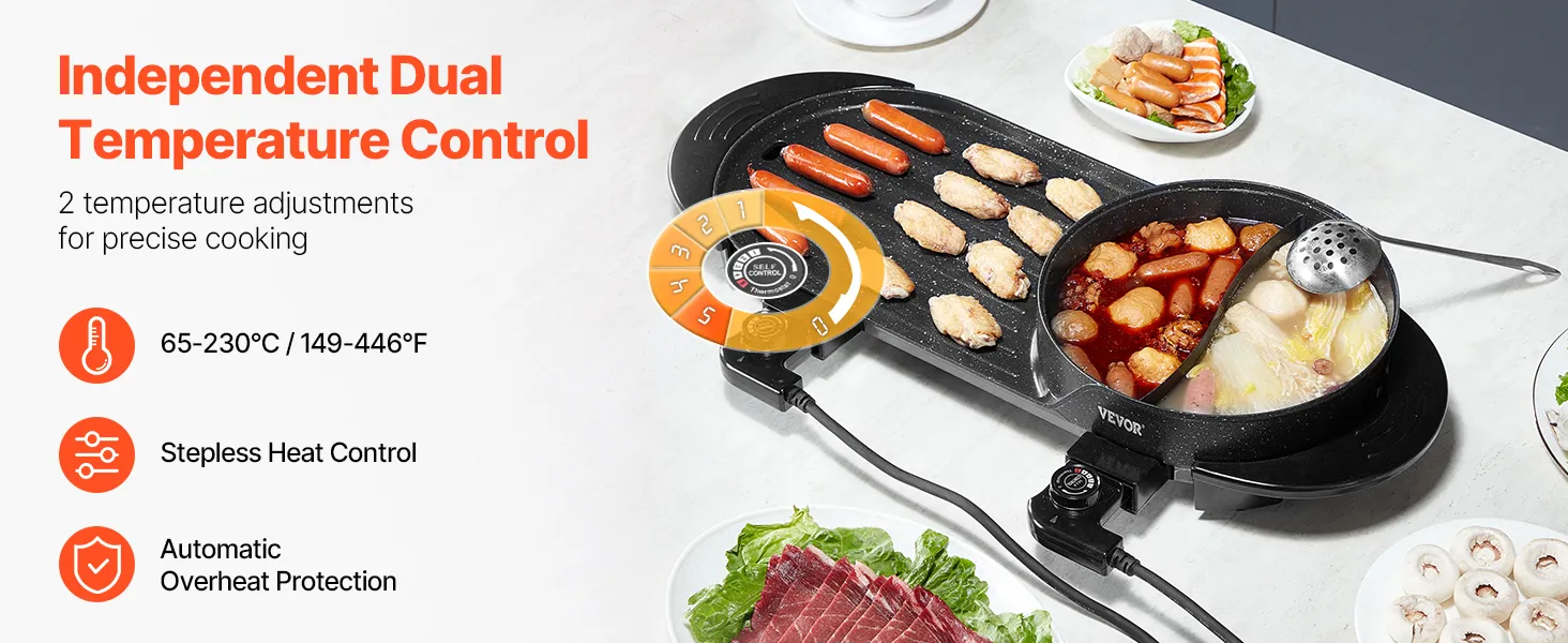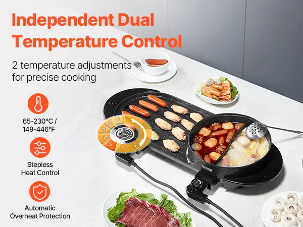Nasz elektryczny garnek z grillem oferuje dwie strefy temperaturowe, umożliwiające oddzielne i precyzyjne ustawianie temperatury. Bez problemu reguluje niską i wysoką temperaturę, nie zakłócając przy tym pracy, zapewniając pełną kontrolę nad pysznymi efektami gotowania.
