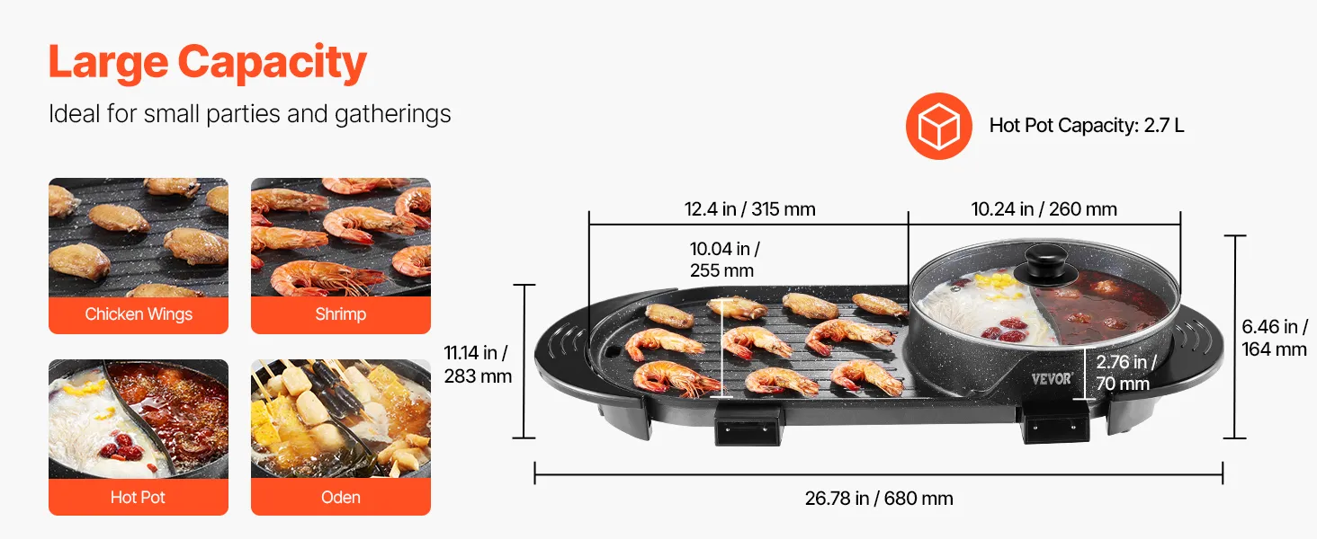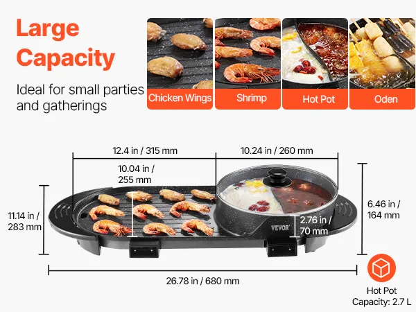 Duża pojemność: Nasz garnek o pojemności 2,7 l z grillem i patelnią grillową o wymiarach 315 x 255 mm mieści w sobie garnek o wymiarach 260 x 70 mm i może z łatwością obsłużyć od 1 do 6 osób, zapewniając świetną zabawę i satysfakcję podczas spotkań towarzyskich.