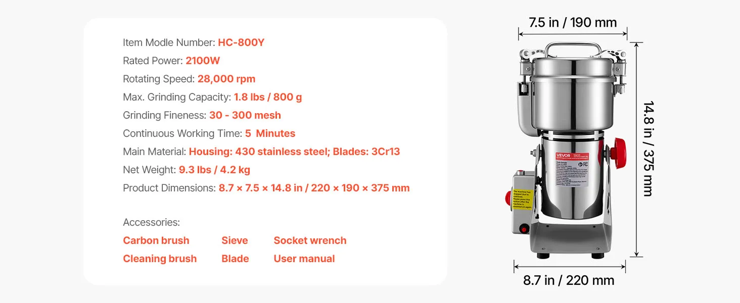 Młynek do zboża VEVOR elektryczny 800 g, 2100 W, stal nierdzewna, młynek do przypraw, suchych ziaren, musli, kawy, kukurydzy, pieprzu, obrotowy rozdrabniacz 220 x 190 x 375 mm