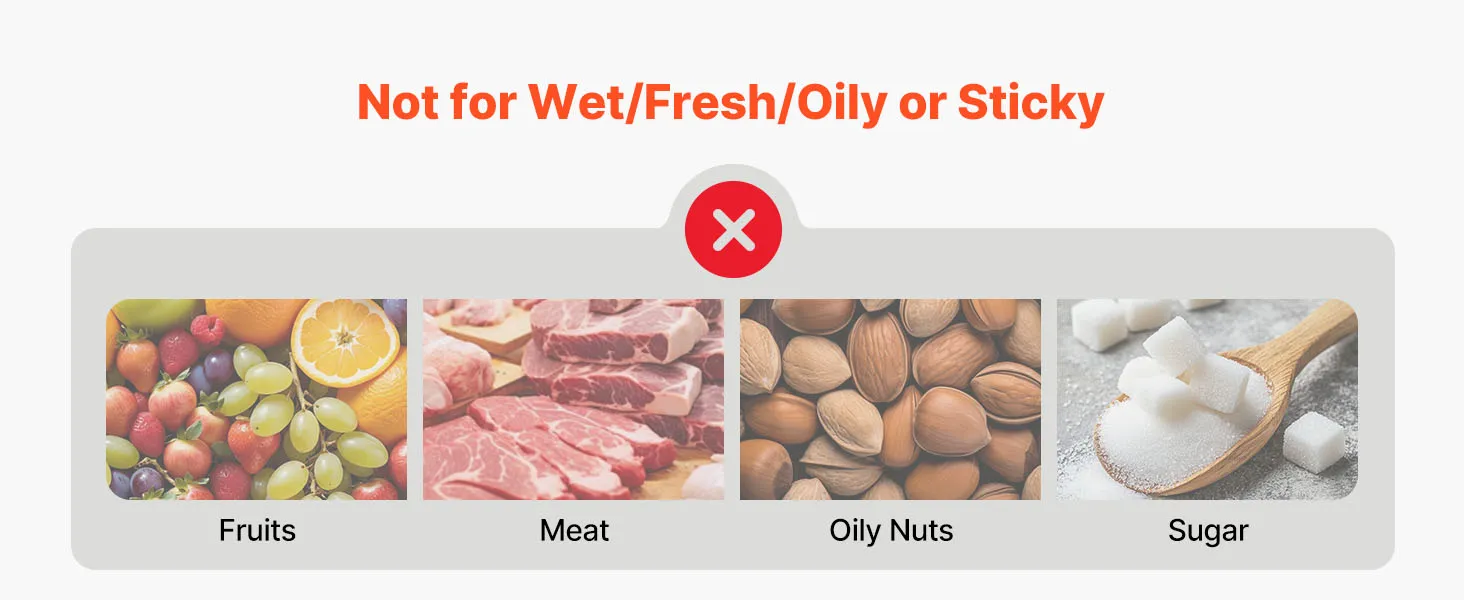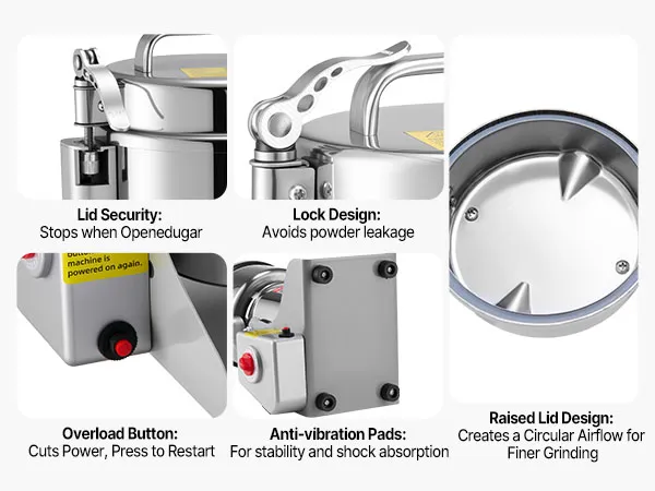 Wielofunkcyjny młynek do produktów suchych: Ten elektryczny młynek do zboża nadaje się do mielenia zbóż (pszenicy, soi, kukurydzy, ziaren kawy) oraz przypraw (pieprzu, cynamonu, anyżu). Twardsze składniki należy wcześniej zgnieść. Nie nadaje się do wilgotnych, oleistych ani lepkich materiałów i jest szeroko stosowany w kuchniach i laboratoriach.