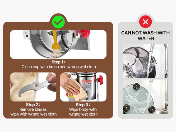 Łatwe czyszczenie: Po zmieleniu młynek do zboża można łatwo wyczyścić wilgotną ściereczką lub szczotką, bez pozostawiania śladów i wysiłku.