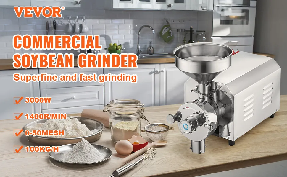 Młynek do soi VEVOR, komercyjny młynek do przypraw, 3000 W, wydajność 100 kg/h, młynek do kukurydzy ze stali nierdzewnej, przemysłowy młynek do mąki, do pieprzu, soi, orzeszków ziemnych, ziaren kukurydzy, 605 x 290 x 460 mm