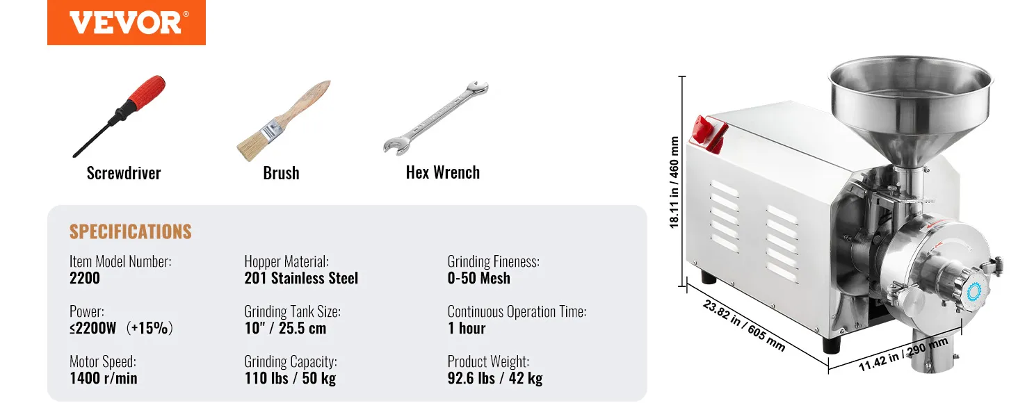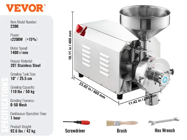 Młynek do soi VEVOR, komercyjny młynek do przypraw, 2200 W, młynek do kukurydzy, 50 kg/h, młynek do kukurydzy ze stali nierdzewnej, przemysłowy młynek do mąki, do pieprzu, soi, orzeszków ziemnych, ziaren kukurydzy, 605 x 290 x 460 mm