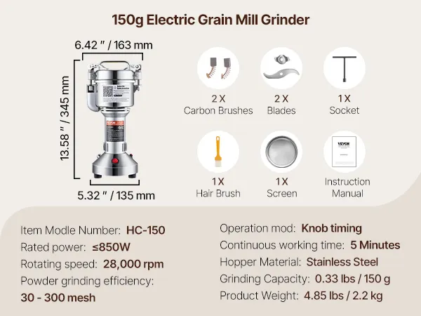 VEVOR electric grain mill, high-speed spice mill with 850 W, stainless steel pulverizer, for dry grains, spices, muesli, coffee, corn, pepper, 163 x 135 x 345 mm VEVOR electric grain mill, high-speed spice mill with 850 W, stainless steel pulverizer, for dry grains, spices, muesli, coffee, corn, pepper, 163 x 135 x 345 mm