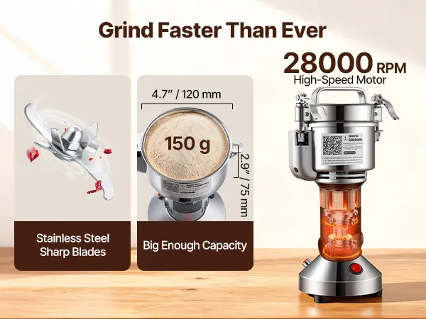 Powerful grinding – Equipped with a reinforced pure copper motor and a thick stainless steel grinding chamber, it operates stably and reliably. The three-layer hardened steel blades ensure fast and fine grinding.