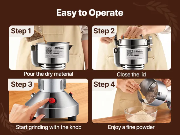 • Multi-purpose dry mill: This powder machine can process various dried materials, including: ① Grains (soybeans, corn, barley, wheat, oats, rye, peas, coffee beans) ② Spices (fennel, pepper, cinnamon, rosemary) ③ Others (if grinding other hard materials, please cut them into small pieces first). (Not suitable for wet, fresh, oily, or sticky materials.) Widely used in homes, kitchens, hospitals, and pharmaceutical factories.