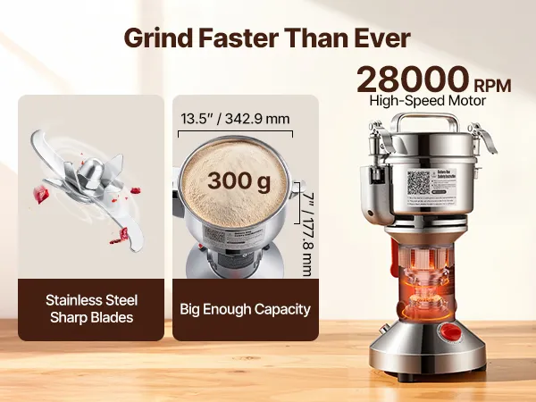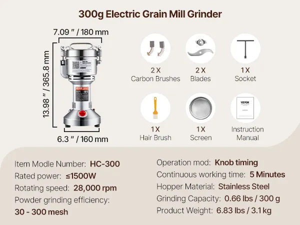 VEVOR Elektryczny młynek do zboża, szybkoobrotowy, 1500 W, 300 g, urządzenie rozdrabniające ze stali nierdzewnej, do suchych ziaren, przypraw, płatków śniadaniowych, kawy, kukurydzy, pieprzu, srebrny, 180 x 160 x 355 mm